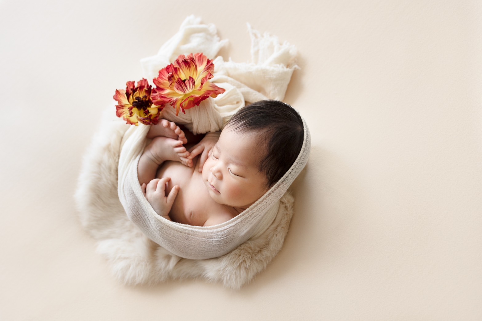 nanahoshi photography ニューボーンフォト ゆるおくるみのポーズに赤いお花を添えて 生花